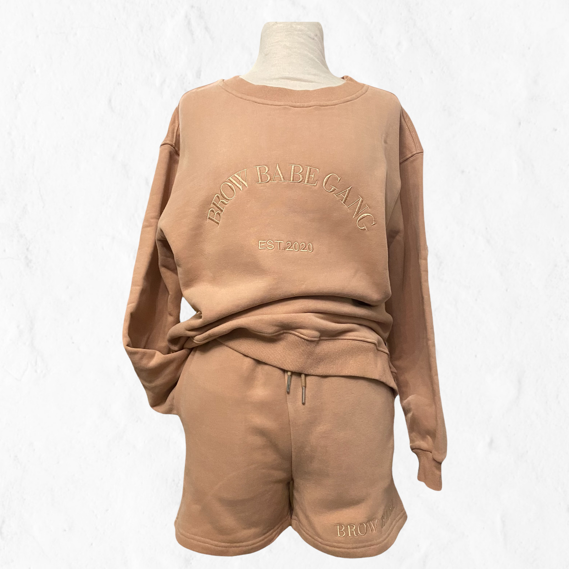 Introducing our Brow Babe Collection in CHAI, the perfect everyday attire for achieving flawless brows! Our crewnecks and lounge shorts are made with 100% plush cotton and feature matching colored embroidery, giving them a stylish touch. The crewnecks have a loose fit and are fleeced lined for a super soft feel, while the high-waisted lounge shorts have a stretchy waistband and a metal capped drawstring, ensuring a comfortable and secure fit.